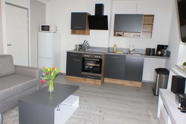 -Kühlschrank, Mikrowelle, Kaffeemaschine, Wasserkocher, Ceranfeld, Backofen, Küchenutensilien, Toaster, Spülmaschine, Esstisch, Hochstuhl, Reinigungsmittel