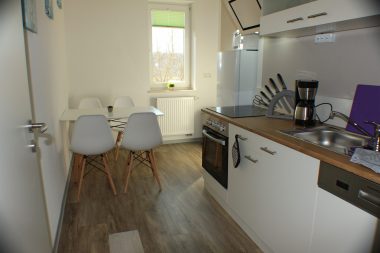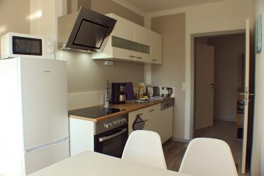 Kühlschrank, Mikrowelle, Kaffeemaschine, Wasserkocher, Ceranfeld, Backofen, Küchenutensilien, Toaster, Spülmaschine, Esstisch, Hochstuhl, Reinigungsmittel